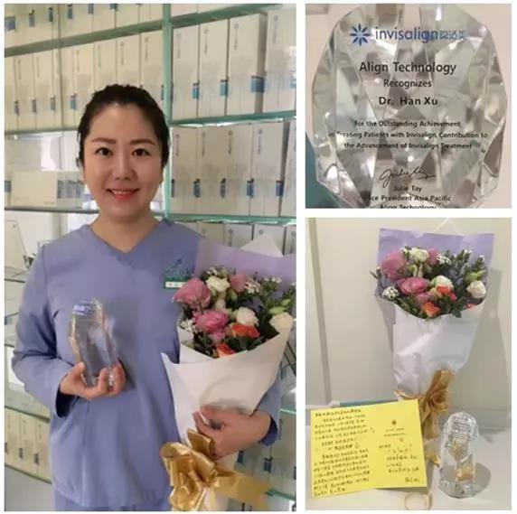 (韩医生获得隐适美白金医生认证奖杯)